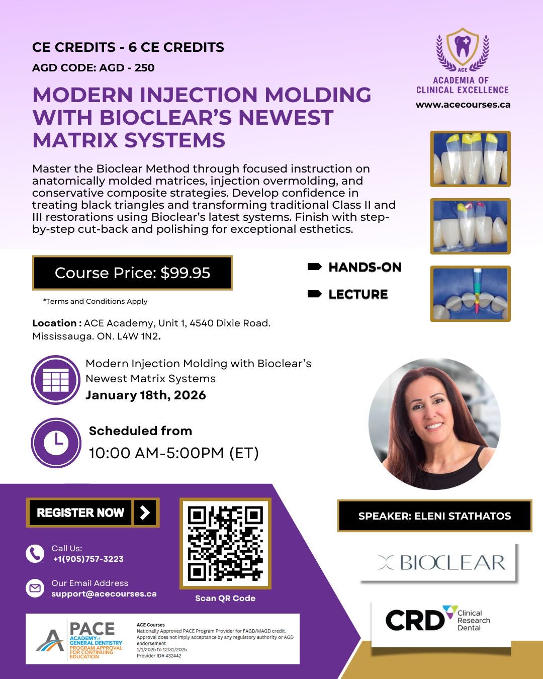 This course provides a comprehensive introduction to the Bioclear Method, giving participants hands-on familiarity with Bioclear instrumentation and the full range of anatomically molded mylar matrices for both anterior and posterior applications. Attendees will learn the five pillars of the Bioclear Method and understand why each is essential for achieving unparalleled clinical success. The program explores injection overmolding techniques used in conservative restorative dentistry, with practical insights into predictable, minimally invasive solutions for managing black triangles. In addition, the course covers the concept of compression in direct posterior restorations, including a detailed examination of the Clark Class II approach, enabling clinicians to improve strength, contacts, and overall restoration longevity.